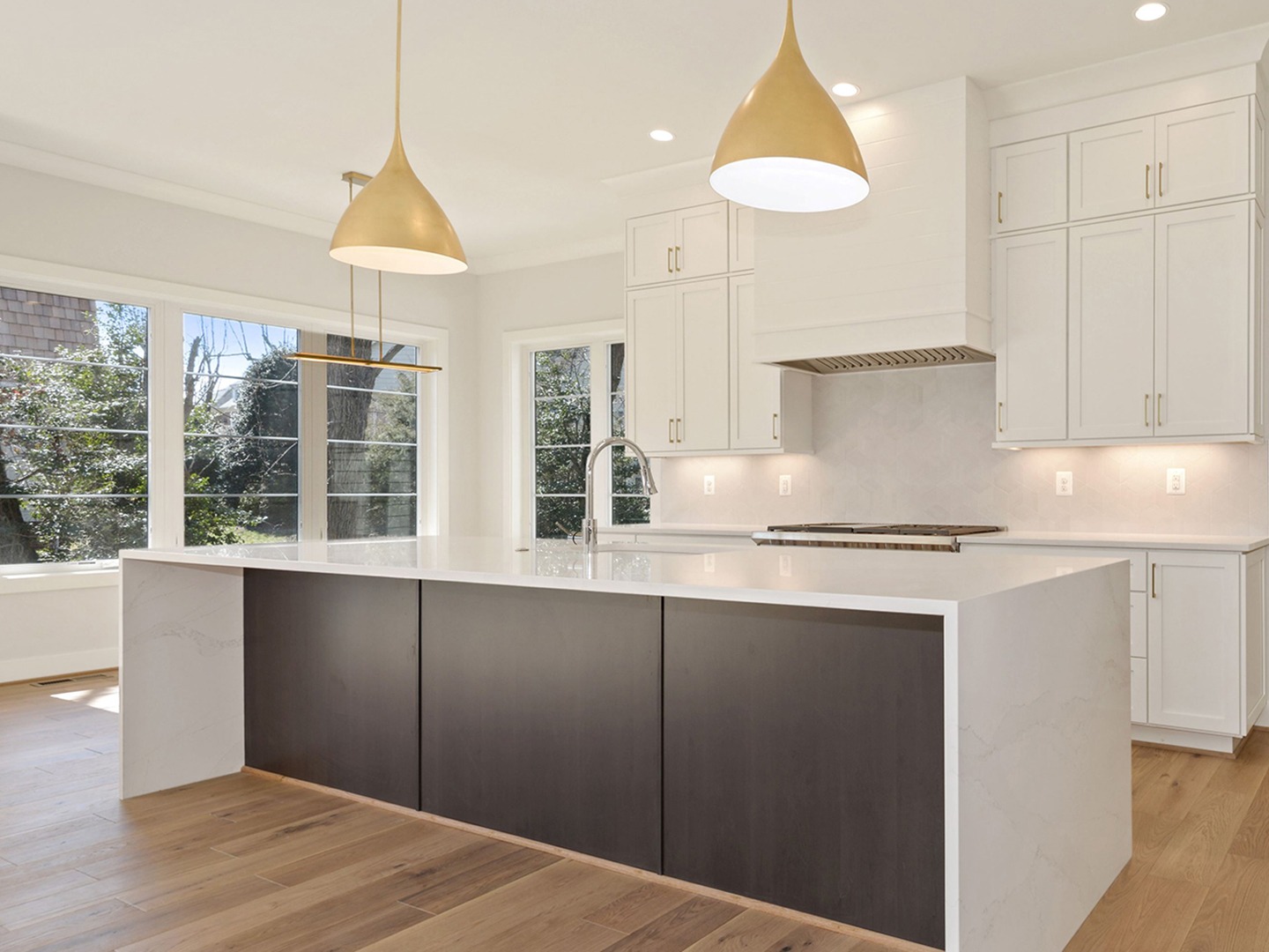 A large island with waterfall edges stands out in the Parkline 60 Kitchen